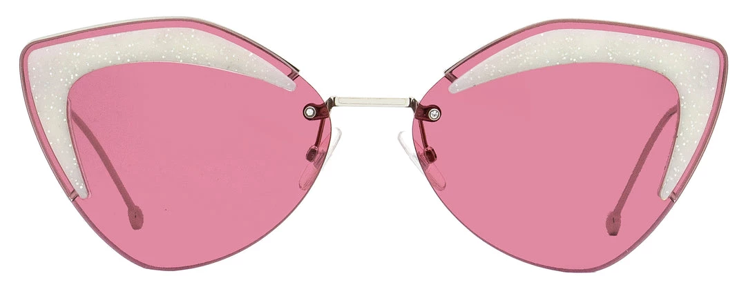The Fendi 0355/S Sunglasses feature a rimless cat eye design for women. The lens features glitter accents at the brow line and adjustable nose pads to ensure a perfect fit. The Fendi sunglass collection features an array of shapes and styles that are daring yet express a refined chic character. Providing 100% UV protection from the suns harmful rays these sunglasses are functional in addition to being fashionable.