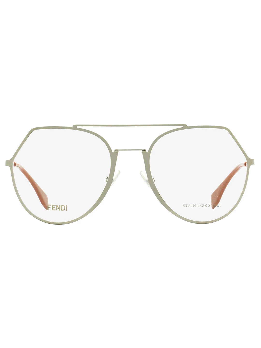 The Fendi 0329 optical frames feature a rounded geometric lens shape and double bridge for women. The stainless steel frame features a thin profile and subtle branding on the temples. The Fendi eyeglass collection features an array of shapes and styles that are daring yet express a refined chic character. Please note these eyeglasses are provided with Demo Lenses in order to demonstrate the final appearance of your frames. Please visit your local Optometrist or Optician to replace with optical quality lenses.