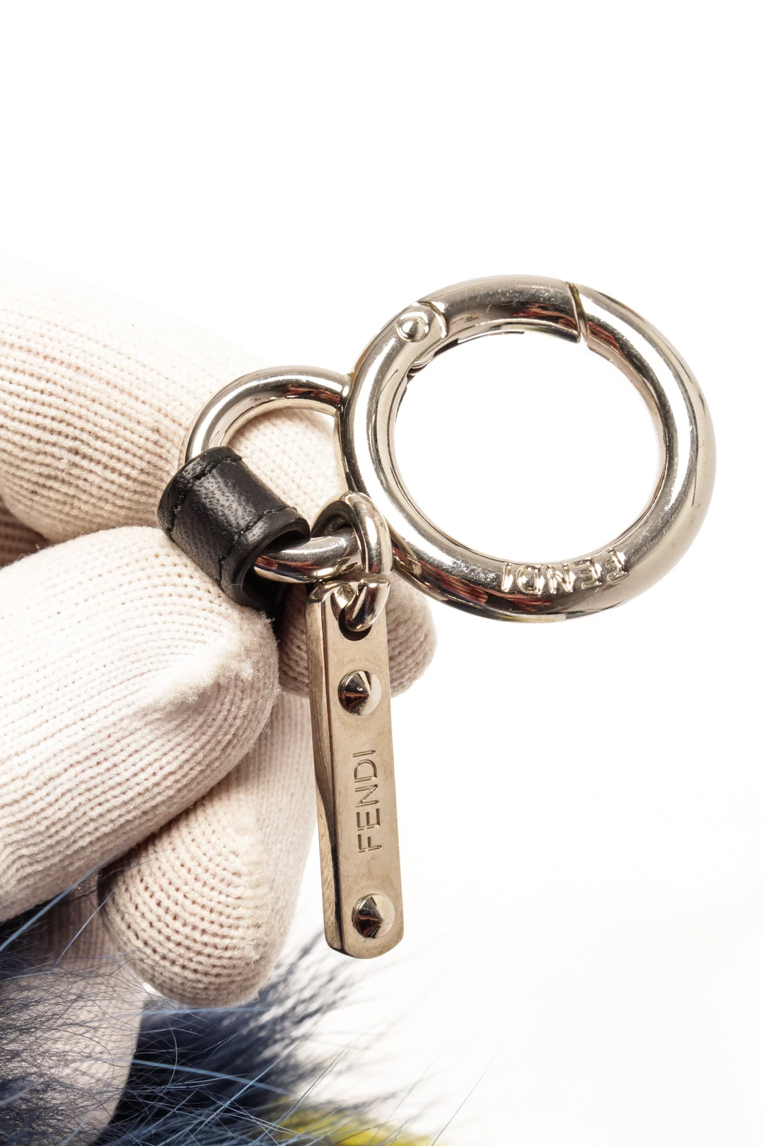 Fendi Tricolor Fur and Leather Zesty Bug Bag Charm with silver-tone hardware and O-ring closure to attach the bag charm to your favorite bag.