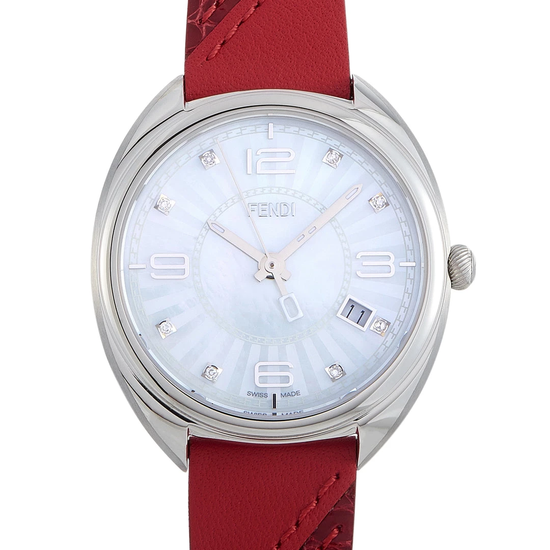 The Fendi Momento watch, reference number F217034573D1, boasts a 34 mm stainless steel case that is presented on a red leather strap, secured on the wrist with a tang buckle. This model is powered by a quartz movement and indicates hours, minutes, seconds and date on the mother of pearl dial accentuated with diamonds. The watch is water-resistant to 100 meters.Offered in an unworn condition, this timepiece includes the manufacturer’s box and papers.