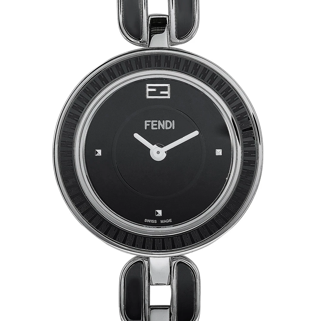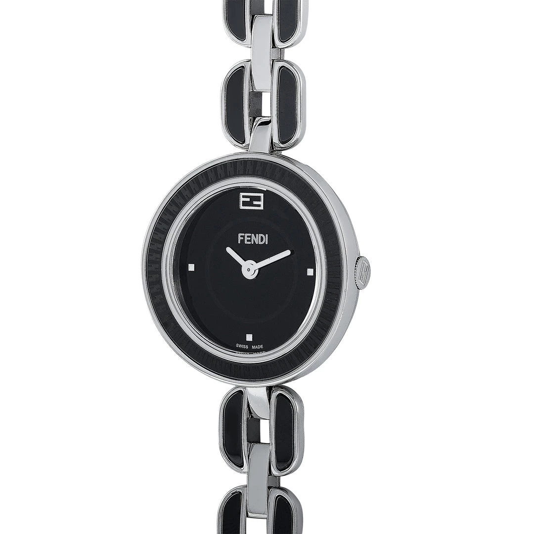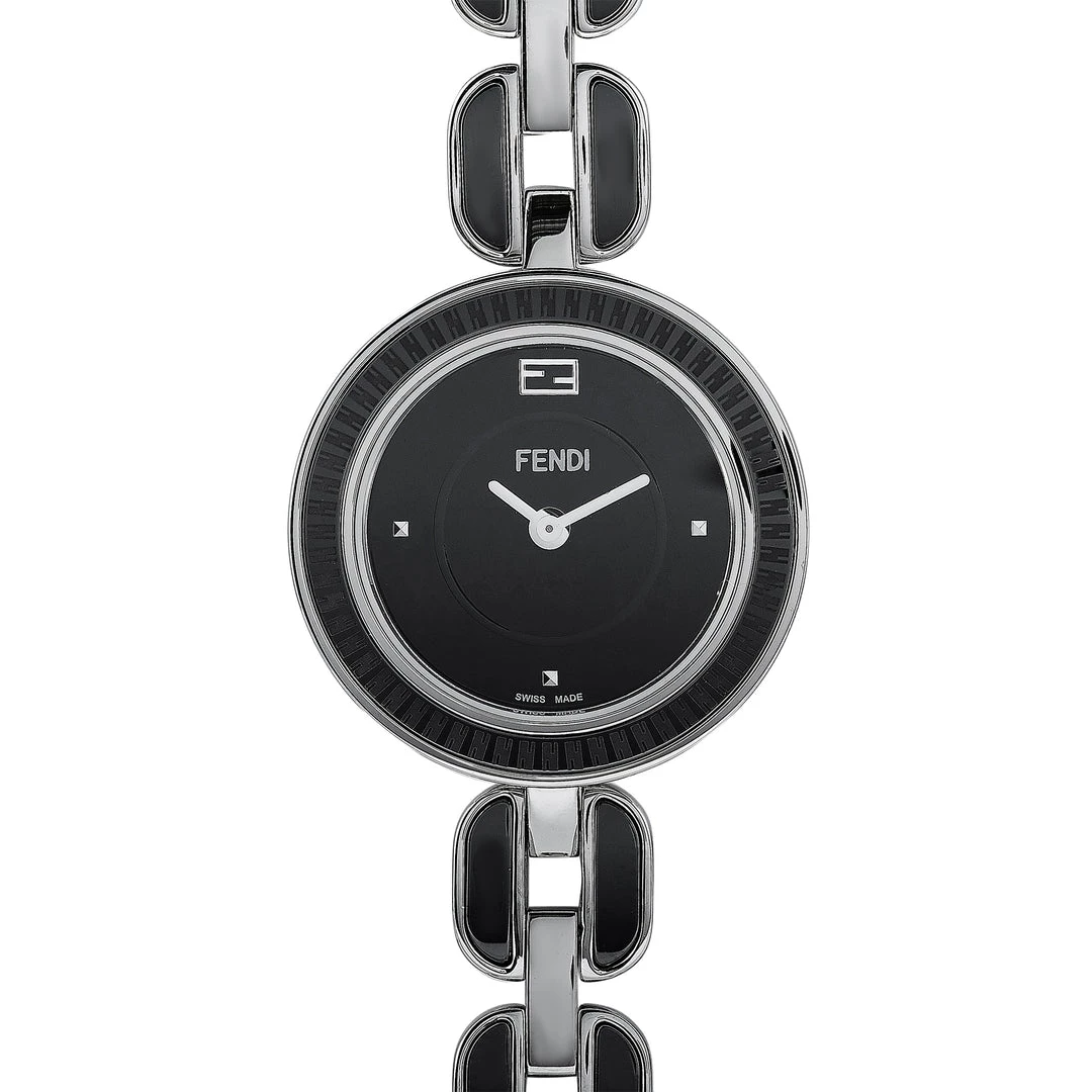 The Fendi My Way watch, reference number F353021001, comes with a stainless steel case that boasts a bezel with a black ceramic inlay. The case is presented on a stainless steel bracelet with black ceramic inserts. This model is powered by a quartz movement and indicates hours and minutes on the black dial. The watch is water-resistant to 50 meters.Offered in an unworn condition, this timepiece includes the manufacturer’s box and papers.