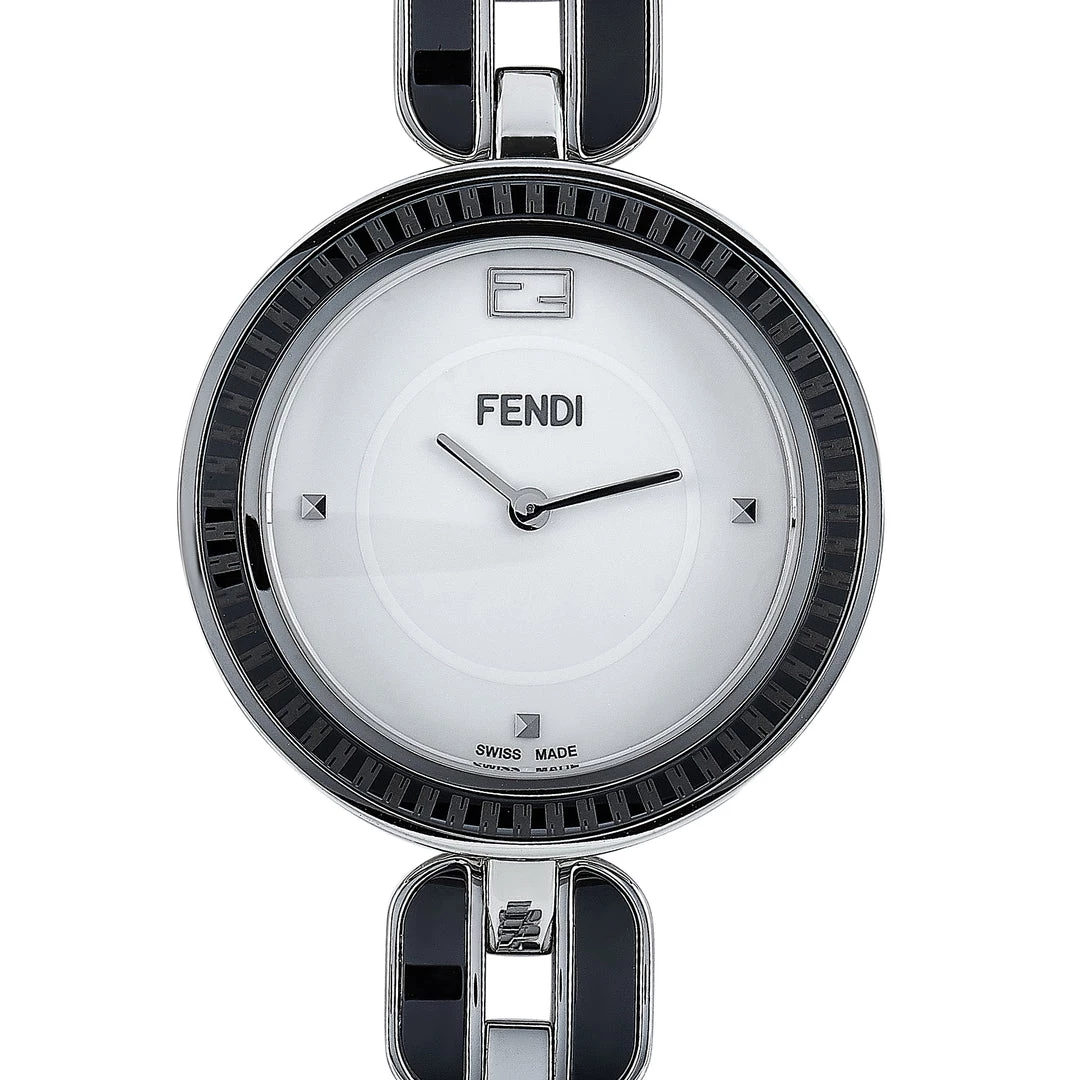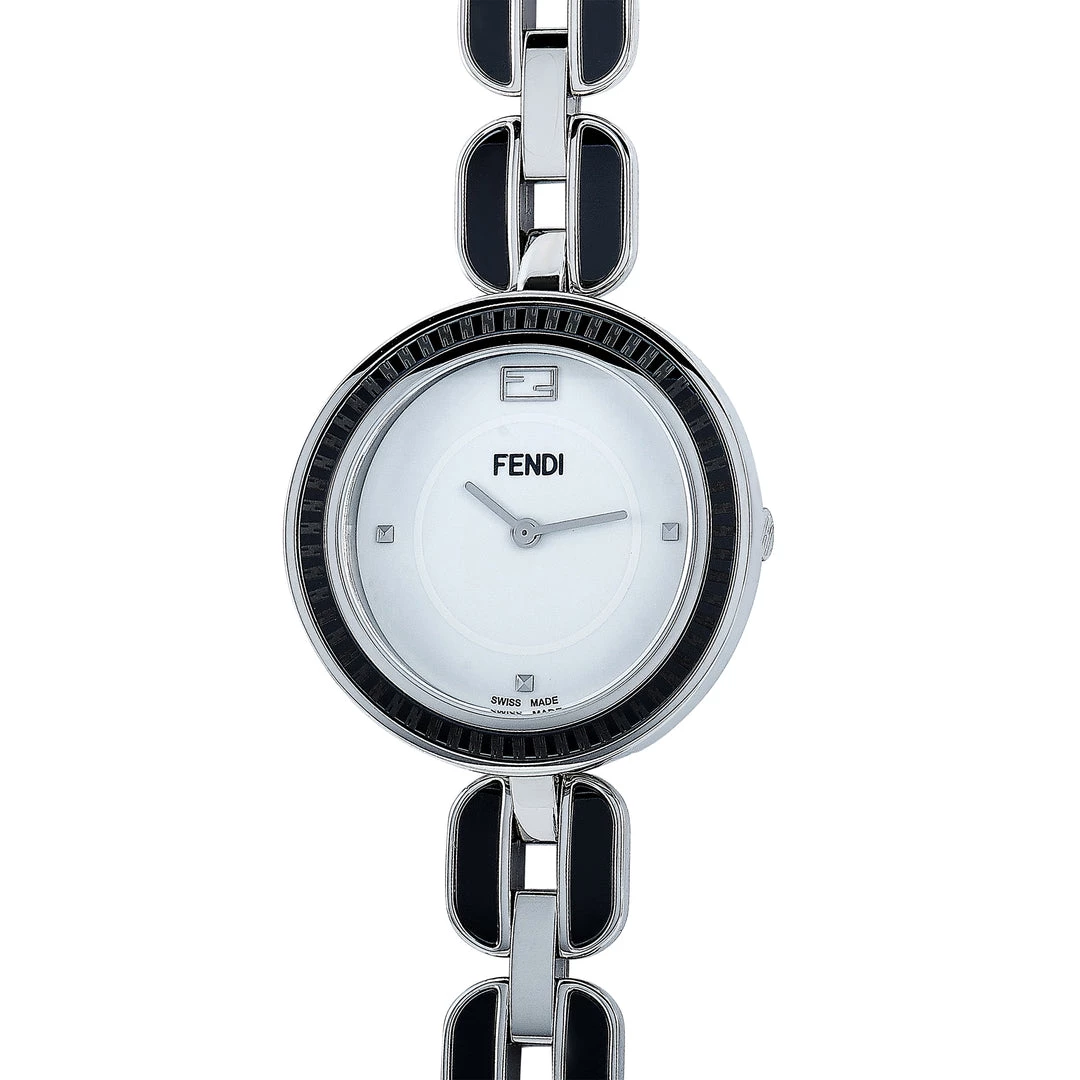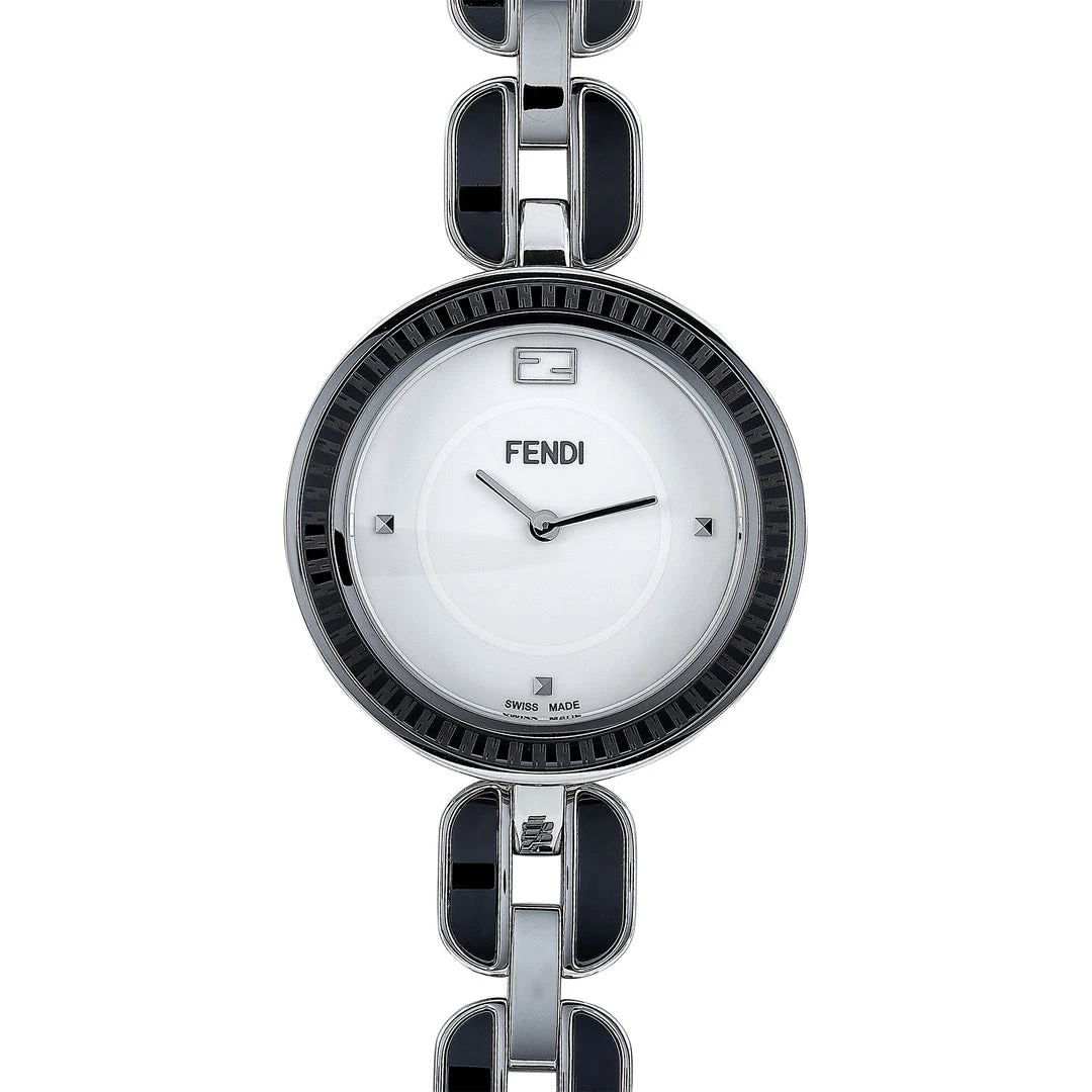 The Fendi My Way watch, reference number F353034001, comes with a 36 mm stainless steel case that boasts a bezel with a black ceramic inlay. The case is presented on a stainless steel bracelet with black ceramic inserts. This model is powered by a quartz movement and indicates hours and minutes on the white dial. The watch is water-resistant to 50 meters.Offered in an unworn condition, this timepiece includes the manufacturer’s box and papers.