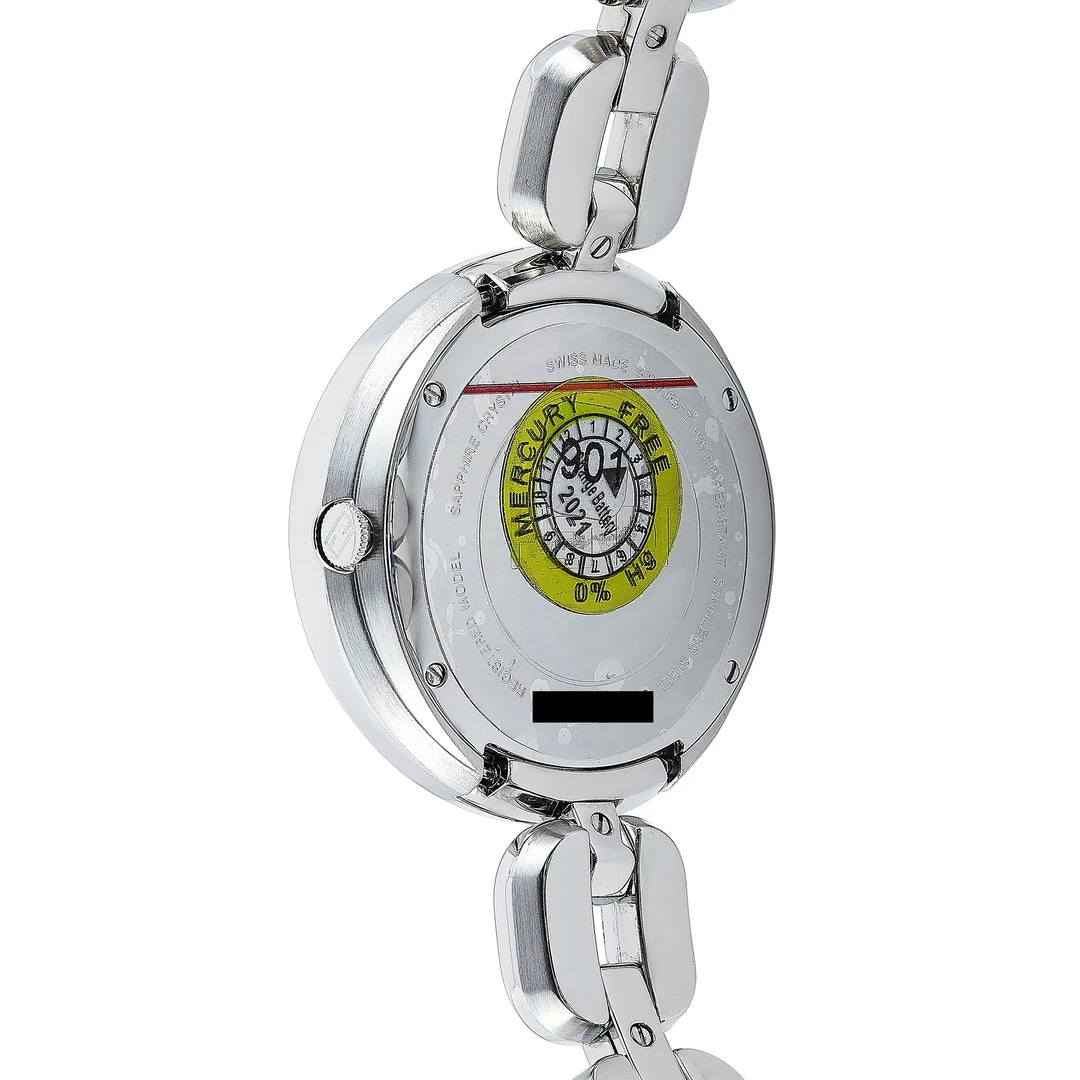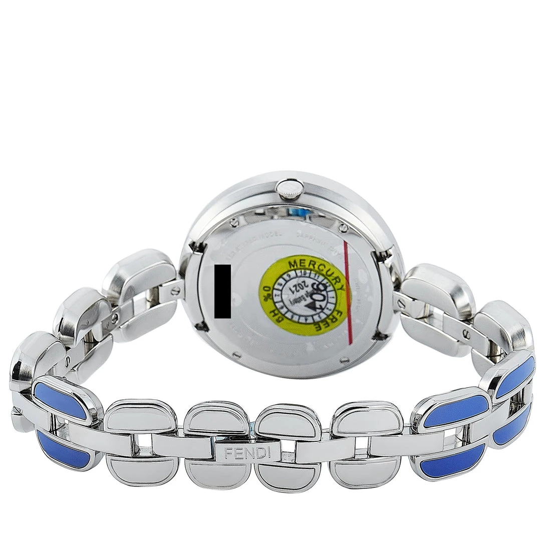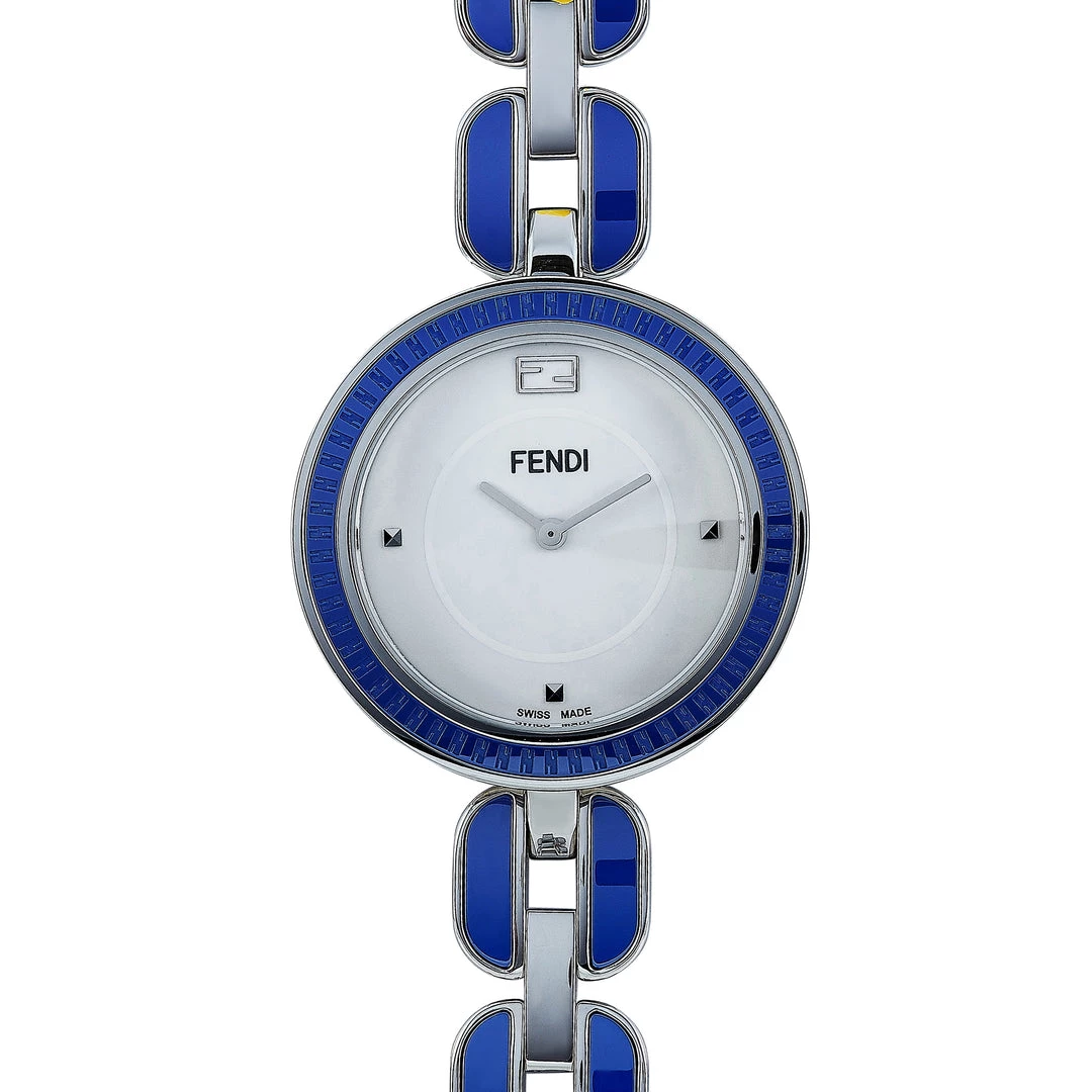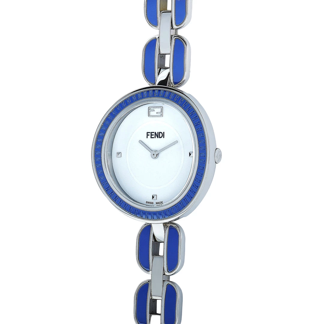 The Fendi My Way watch, reference number F357034003, comes with a 36 mm stainless steel case that boasts a bezel with a blue ceramic inlay. The case is presented on a stainless steel bracelet with blue ceramic inserts. This model is powered by a quartz movement and indicates hours and minutes on the white dial. The watch is water-resistant to 50 meters.Offered in an unworn condition, this timepiece includes the manufacturer’s box and papers.