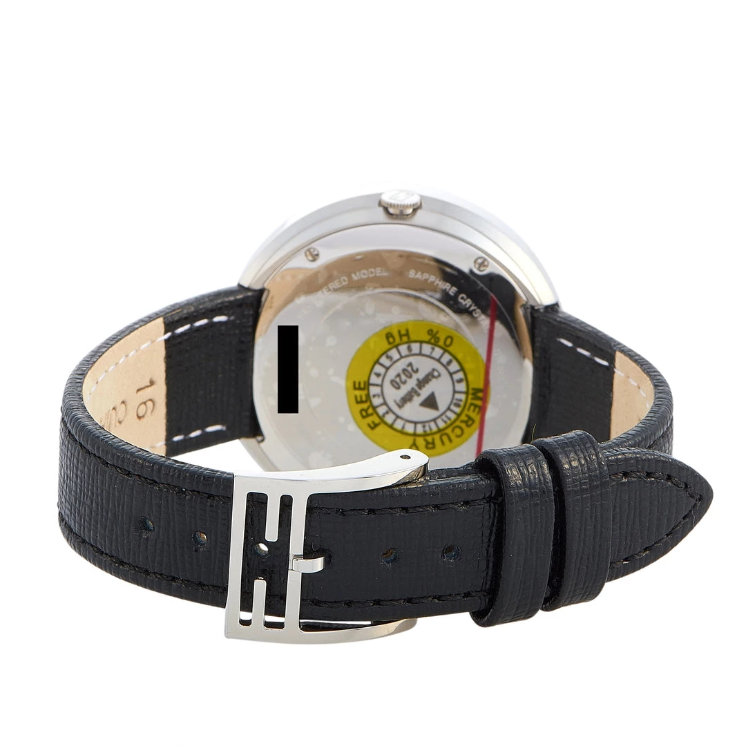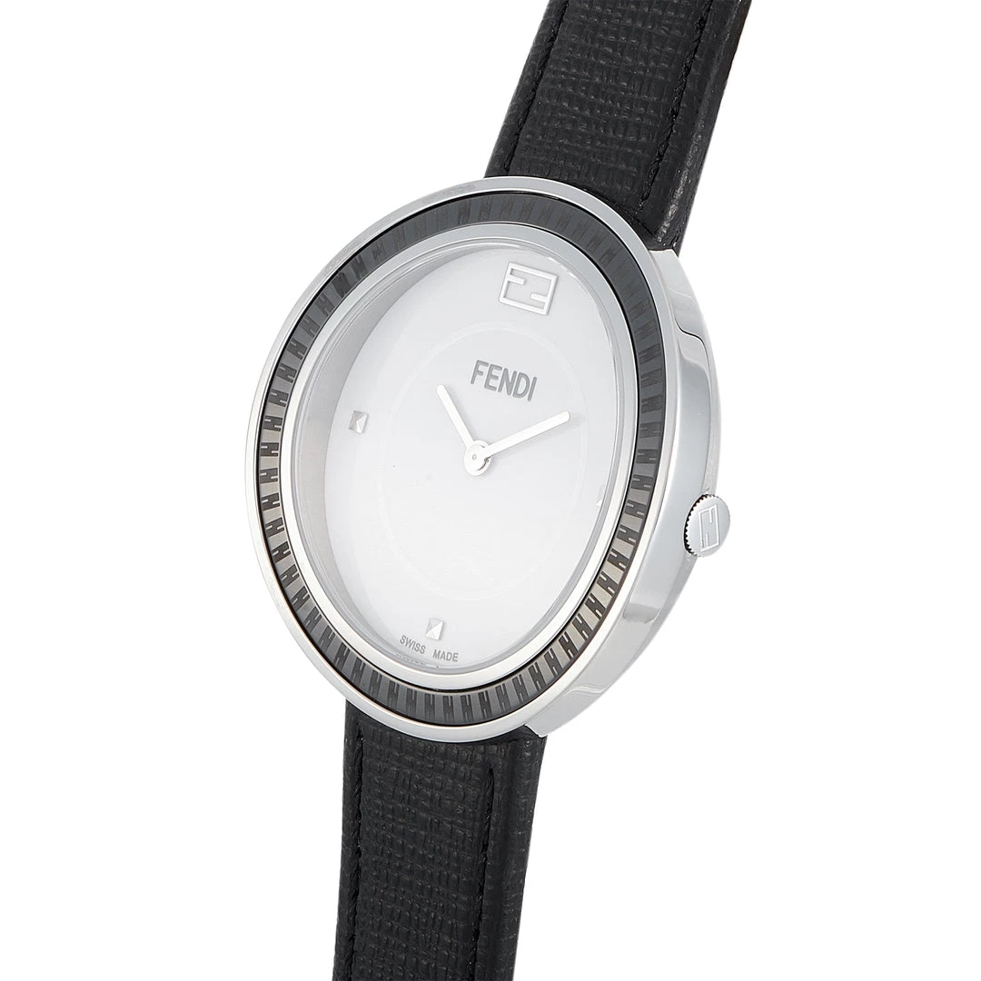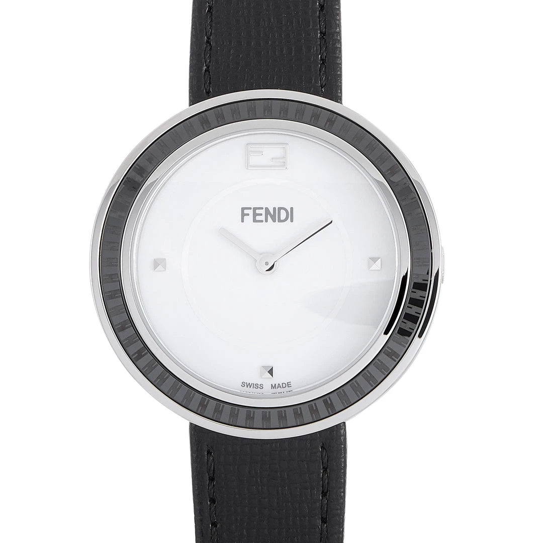 The Fendi My Way watch, reference number F352034011, boasts a 36 mm stainless steel case fitted with a black ceramic bezel. The case is presented on a black leather strap, secured on the wrist with a tang buckle. This model is powered by a quartz movement and indicates hours and minutes on the white dial. The watch is water-resistant to 50 meters.Offered in an unworn condition, this timepiece includes the manufacturer’s box and papers.