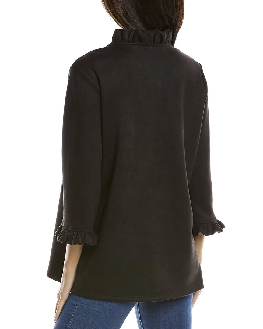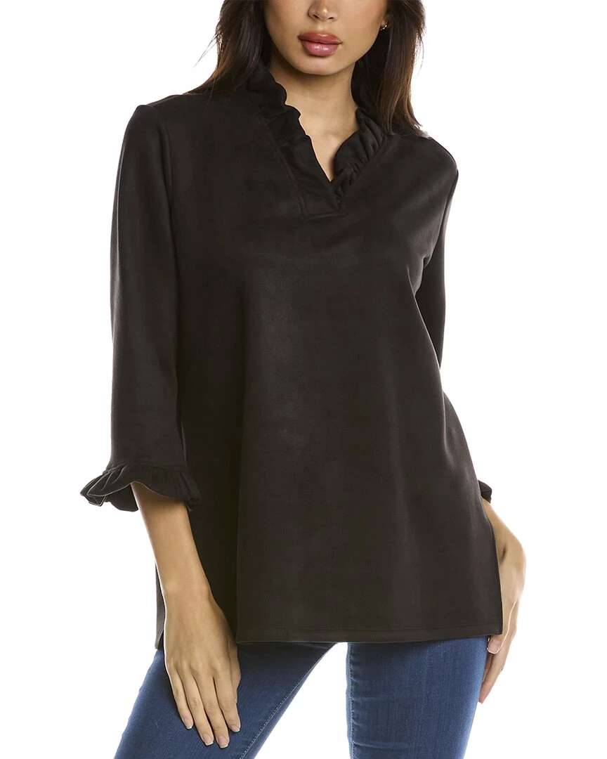 - Design Details – Faux Suede Design, Ruffle Neckline, 3/4-Length Sleeves, And Slits At Hem